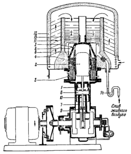 Оба пространства связаны друг с другом через каналы. По ходу каналов размещено при теплообменника: холодильник 3, состоящий из большого числа водяных охладительных труб, генератор 4, состоящий из медной тонкой проволоки диаметром 20—25 мк, конденсатор 5, в котором имеются ребра внутри и снаружи 6.