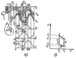 Кривошипы коленчатого вала размещены под углом β (рис.3,а), так что вытеснитель работает с некоторым опережением по сравнению с поршнем. В машине одновременно происходят два процесса: процесс получения холода — внутренний процесс, в идеальном случае соответствующий циклу Стирлинга (рис. 3,б), и процесс ожижения газа — внешний.