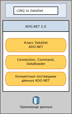 Технология LINQ to DataSet в первую очередь используются в методах расширений в классах DataRowExtensions и DataTableExtensions. Технология LINQ to DataSet построена на основе архитектуры ADO.NET 2.0 и использует ее, но не заменяет ADO.NET 2.0 в коде приложения. Существующий код ADO.NET 2.0 продолжит работать в приложении LINQ to DataSet. Связь между LINQ to DataSet и ADO.NET 2.0 и хранилищем данных показана на следующей схеме.