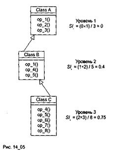 DIT определяется как максимальная длина пути от листа до корня дерева наследования классов. Для показанной на рис. 14.3 иерархии классов метрика DIT равна 3.