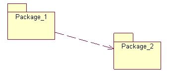 Между пакетами допускается только одна разновидность отношений - отношение зависимости. В данном случае это означает, что пакет 1 зависит от пакета 2. Допускается использование и нескольких уровней пакетов: внутри пакета могут находиться пакеты следующего уровня.
