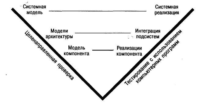 Основной недостаток стандартных проверок заключается в том, что проверяется то, что уже имеется (модели, программы), а не то, что там должно быть. При целенаправленной проверке все модели проверяют по мере их создания на предмет соответствия требованиям проекта. Модель целенаправленной проверки [7] представлена на рис. 7.1.