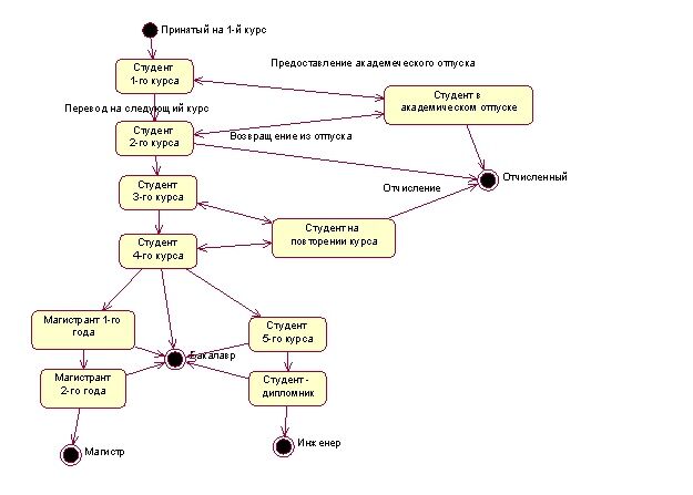 Если нет ни одного из перечисленных случаев, то можно обойтись и без этой диаграммы. Все переходы между состояниями (события) оформляются приказами. На диаграмме используют обозначения, приведенные на рис. 2.16. На рис. 2.17. представлена упрощенная диаграмма состояний процесса обучения студента в вузе.