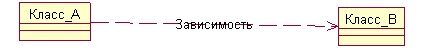 Отношение зависимости определяет, что изменение одного класса может повлиять на другой класс, который его использует, причем обратное в общем случае неверно. Это отношение необходимо указать, если один класс (клиент) использует другой (сервер). Зависимость показана на рис.2.13; изменения в Класс_В (сервер) могут повлиять на Класс_А (клиент).