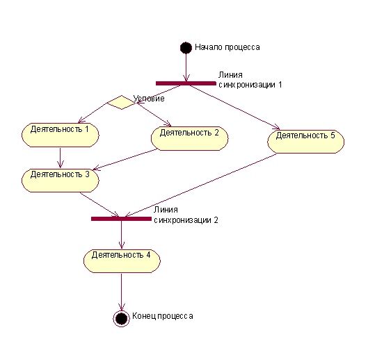 Линия синхронизации 1 означает, что после начала процесса проверка условия и деятельность 5 могут выполняться одновременно. В зависимости от условия 1 выполняется либо деятельность 1 либо деятельность 2; деятельность 3 может начинать выполняться после их завершения. Линия синхронизации 2 означает, что деятельность 4 может выполняться после завершения деятельности 3 и деятельности 5.