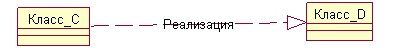 Отношение реализации (рис. 2.14.) задается между классами, один из которых описывает действия, а другой гарантирует их выполнение. Чаще всего реализации используют для определения отношений между интерфейсом и классом, который предоставляет объявленные в интерфейсе операции или услуги. Интерфейс позволяет отделить спецификацию (сам интерфейс) от реализации. В нашем случае Класс_С реализует интерфейс Класс_D.