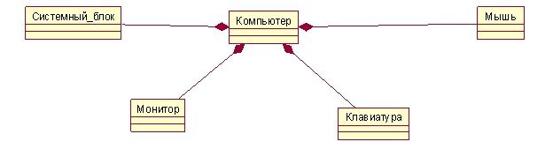 Имеется разновидность отношения ассоциации – отношение агрегации. Оно показывает, что один класс содержит в своем составе другие классы. Пример отношения агрегации приведен на рис. 2. 11.(дата состоит из дня, месяца, года). Характеристики этого отношения совпадают с характеристиками отношения ассоциации. Различают агрегацию по ссылке и по значению (именуемое иногда отношением композиции). Отношение композиции (рис.2.12.) предполагает, что составные части не имеют смысла бес своего владельца.