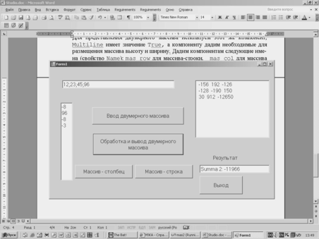 Рассмотрим ввод/вывод массивов на примере формы рис.4.2 (Одномерный массив может быть представлен как в виде строки, так и в виде столбца). В обоих случаях используется знакомый нам компонент TextBox, но для представления массива столбцом необходимо свойству Multiline придать значение True. После этого можно «вытянуть» этот компонент по вертикали. Для представления двумерного массива используем этот же компонент, Multiline имеет значение True, а компоненту дадим необходимые для размещения массива высоту и ширину. Дадим компонентам следующие имена (свойство Name): mas_row для массива-строки, mas_col – для массива-столбца, mas22 - для двумерного массива, result – для результата. Тип данных в компонентах TextBox по прежнему String.
