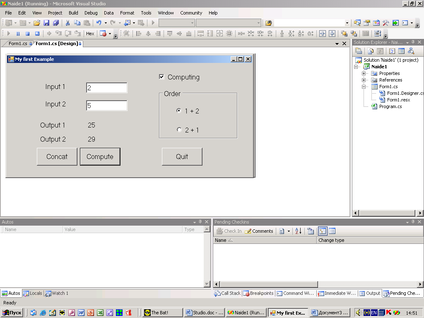 Для начала поменяем свойство формы Text на My first Example и увидим, что изменился заголовок формы.