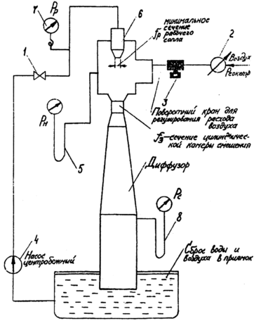 Принципиальная схема установка показана на рис.1. Рабочая вода после насоса 4 через вентиль 1 подается к рабочему соплу 6 эжектора.