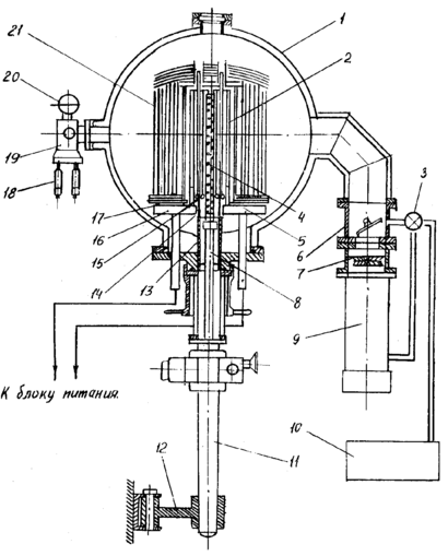 Витки этой спирали расположенные перпендикулярно к направлению движения контейнера с веществом. Спираль подвешена на 6 опорах, которые приварены к нагревателю. Для изоляции нагревателя от системы экранов использованы керамические пластины из окиси алюминия, которые подложены под опоры. Теплоизоляция создается многослойными экранами 9, состоящими из наружного и внутреннего слоев. Экраны выполнены в виде отдельных блоков, что обеспечивает их разборку и для свободного доступа к нагревательному элементу и быструю смену вышедших из строя экранов.
