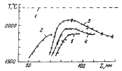 ис.4. Распределение температуры по высоте столба расплава иттрий-алюминиевого граната в контакте с молибденом контейнера и монокристаллом: