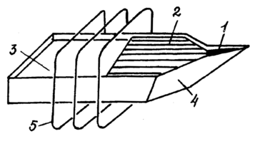 Рис.2 Схема метода горизонтально направленной кристаллизации(метод Багдасарова): 1- затравка; 2 - кристалл; 3 - расплав; 4 - контейнер; 5- нагреватель