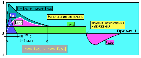 Токи абсорбции могут устанавливаться в диэлектрике в течение длительного времени в зависимости от типа диэлектрика и механизма поляризации. Уменьшение тока Iабс может наблюдаться в течение минут или даже часов. После установления тока абсорбции через диэлектрик будет протекать только ток сквозной проводимости.