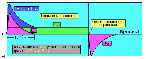 В момент включения постоянного электрического поля через диэлектрик электрического конденсатора протекает ток смещения - Iсм, обусловленный быстрыми видами поляризаций.