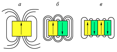 Разделение сегнетоэлектрика на домены приводит к уменьшению деполяризующего поля. Если, например, образец сегнетоэлектрика состоит из двух доменов с противоположно направленной поляризацией (рис. 5б), то требуемая энергия была бы намного меньше, чем в первом случае, однако она еще значительно больше возможного минимума. Можно представить себе еще более стабильную структуру, в которой имеется четыре противоположно поляризованных домена (рис. 5в). В результате деполяризующее поле существенно уменьшается и деполяризации кристалла не происходит. Однако процесс разбиения на домены не может идти беспредельно, так как на образование доменных стенок, то есть границ между доменами, затрачивается определенная энергия. По-видимому, равенство энергии деполяризующего поля и энергии доменных стенок ставит предел дальнейшему разбиению образца на домены и определяет равновесный размер доменов.