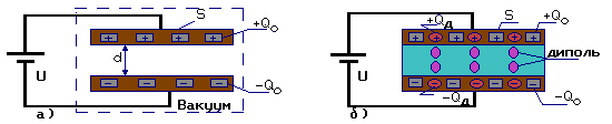 На рисунке а) показан конденсатор, помещенный в вакуум. В этом случае на его пластинах возникнет заряд Qo. На рисунке б) показан тот же конденсатор, между пластинами которого вставлен диэлектрик толщиной, равной расстоянию между электродами.