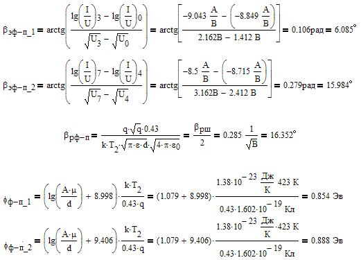 При 100 °С |βшэ - βшэ | ~ 0.5 º < |βф-пэ_1,2 – βф-пр_1,2| ~ 3º - 5º шоттковкий механизм токопрохождения более адекватен экспериментальным данным. Значения теоретических величин ближе, измеренным в эксперименте. Для данной плёнки характерна надбарьерная электронная эмиссия.