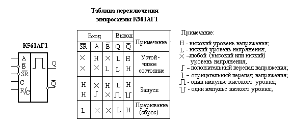 | Рис. П5. Схема вводов и таблица переключений одновибратора К561 АГ1 |