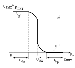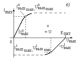 Максимально развиваемые выходные токи I 0вых, I 1вых и соответственно напряжения U 0вых, U 1вых определяются моментом выхода на пологие участки выходных ВАХ и зависят от величины напряжения Eпит (конкретные величины приведены на рис. П.3, б).