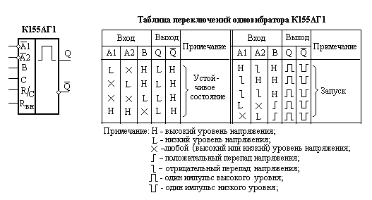 | Рис. П4. Схема вводов и таблица переключений одновибратора К155 АГ1 |