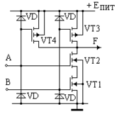 Электрические схемы, обозначения схем как логических элементов и таблицы состояний для КМОП-элементов приведены в табл. П.1. Для ЛЭ на основе КМОП характерно весьма высокое входное сопротивление: Iвх = Iут 0,1мкА (T=200C) 1 мкА