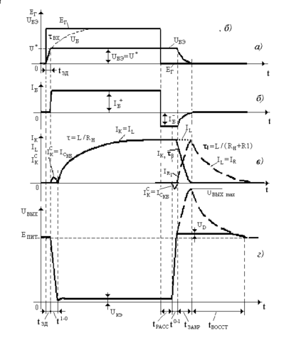 (рис. 3.3, а, б): – формирование времени задержки (tЗД) и формирование фронта включения (t1-0). Пусть транзистор закрыт. Исходное положение рабочей точки на семействе выходных характеристик соответствует точке “A”