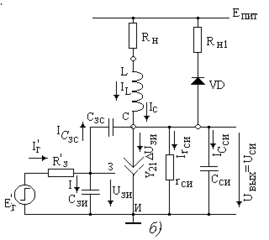 Первое приближение – считаем транзистор безинерционным, т.е. S, СЗС, СЗИ, ССИ = 0. Будем считать, что в начальной стадии транзистор VT закрыт (см. схему на рис. 4.3, а), и на выходе наблюдается высокое напряжение UВЫХ = EПИТ. Схема замещения ключа представлена на