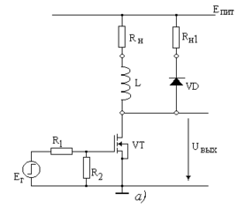 За время нахождения транзистора во включенном состоянии UВЫХ 0, ток индуктивности (L) = ток стока транзистора (IС) будет нарастать с постоянной времени L / RН, и к окончанию действия запускающего импульса достигнет определенной величины.
