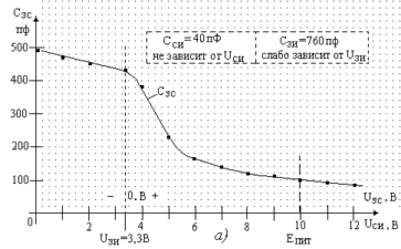 Дополнительно, для данного типа прибора на рис. 4.2. а, б представлены зависимости CЗС = f (UСИ) и IС = f (UЗИ). Эти характеристики полезно использовать при проведении оценочных расчетов длительности переходных процессов в ключе.