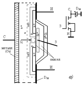 Такие характеристики транзистора получены благодаря особенностям его конструкции. На рис. 4.1, а представлена одна из ячеек прибора. Транзистор имеет несколько сотен таких ячеек. Каждая ячейка имеет сильнолегированные n+ - стоковую и истоковую области, что понижает сопротивление транзистора во включенном состоянии (RСИ ВКЛ).