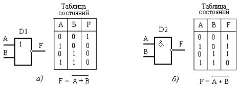 | Рис. 1.1 Графическое обозначение, таблица состояний и уравнение функционирования для логических элементов ИЛИ-НЕ (а) и И-НЕ (б) |