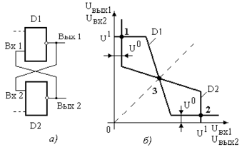 Бистабильная ячейка (БЯ) простейших триггеров потенциального типа содержит два инвертирующих элемента, охваченных перекрестными обратными связями (рис. 1.2, а). Поскольку выходное напряжение одного инвертора является входным напряжением для другого, то оценку возможных устойчивых состояний ячейки можно провести, воспользовавшись совместным построением их передаточных характеристик (рис. 1.2, б). Точки пересечения таких характеристик являются точками возможных состояний ячейки. Например, в точке 1 инвертор D1 не находится в активной области характеристик - "ключ заперт", и на его выходе наблюдается уровень UВЫХ = U1. Инвертор D2 также не находится в активной области–"ключ открыт", и на его выходе поддерживается уровень UВЫХ = U0. Это обуславливает устойчивое состояние бистабильной ячейки. Аналогично, в точке 2 инвертор D1 "открыт", а и