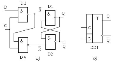 На рис. 1.6 представлена схема D‑триггера на ЛЭ И‑НЕ. ЛЭ D1 и D2 образуют асинхронный RS‑триггер, ЛЭ ДЗ и Д4 обеспечивают синхронизацию и одновременное управление БЯ по входам