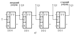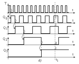 | Рис.1.9. Асинхронный счетчик импульсов по основанию "2" (а); | |
