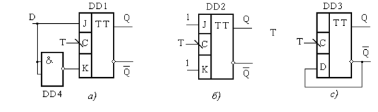 На основе JK‑триггеров могут быть созданы D‑триггеры (Рис. 1.9, а) и Т‑триггеры (Рис. 1.9, б, с).