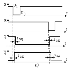 Рассмотрим RS‑триггеры на основе ЛЭ И‑НЕ (Рис. 1.4, а). В этом случае используются ЛЭ на основе ТТЛ, МОП, КМОП.