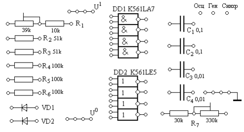 На стенде смонтированы микросхемы серии K561. Четыре независимых элемента 2И‑НЕ обеспечивает схема К561ЛА7, четыре независимых элемента 2ИЛИ‑НЕ — схема К561ЛЕ5. Представлен необходимый набор резисторов R, в том числе два переменных, набор конденсаторов C и диодов. Внешний вид стенда представлен на рис.3.6. При сборке заданной преподавателем схемы пользуйтесь внешними соединительными проводниками. К входным цепям ЛЭ присоединяться в последнюю очередь. Стенд позволяет подключить запускающий генератор (Ген), осциллограф (Осц), провести синхронизацию осциллографа (Синхр).