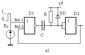 Другой вариант ЖМВ на двух инверторах И‑НЕ и осциллограммы в характерных точках представлены на рис.3‑4. В этой схеме для обеспечения устойчивого состояния на оба входа ЛЭ D2 должен поступать высокий потенциал U1, при этом на входе ЛЭ D1 возникает уровень U0. Схема запускается по входу 2‑1 перепадом EГ от U1U0 и позволяет получить на выходе ЛЭ D2 импульс положительной полярности близкий по форме к прямоугольной. Длительность генерируемого импульса определяется по формуле