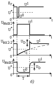 | Рис. 3.4. Вариант схемы ждущего мультивибратора - (а); осциллограммы переходных процессов в характерных точках -(б) | |