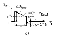 | Рис. 3.2. Эквивалентная схема замещения (а) и осциллограмма перезарядки времязадающего конденсатора (б) | |