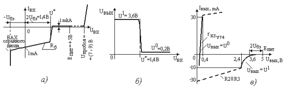 Многоэмиттерный транзистор VT1 обеспечивает логическую функцию "И", транзистор VT2 -функцию "НЕ", транзисторы VT3, VT4 – усилитель мощности. Основные характеристики (входная, передаточная и выходные) приведены на рис. П2 а, б, в соответственно.