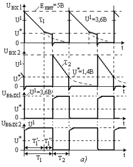 Все это необходимо принимать во внимание при обеспечении квазиустойчивых состояний MB, а также при оценке длительности квазиравновесных стадий. В частности, для обеспечения UВХ=U0 в схеме, построенной по первому варианту (рис.5.1, а) накладываются ограничения на максимальную величину резисторов R1 и R2, так чтобы I0ВХ(R1||R2)<1,0 В, а существенное изменение входного тока при UВХ=U* может привести к усложнению переходного процесса (рис.5.4, а) при повышенной величине резисторов (R1, R2 1кОм) и к возникновению повышенной нестабильности длительности (см. Т1'') генерируемых полупериодов колебаний (подробнее смотри лаб. раб. № 4).