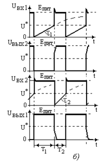 Работа мультивибратора, построенного по второму варианту (рис.5.1, б) в идейном плане не отличается от работы автогенератора, рассмотренного выше. Предлагается читателю самому, пользуясь приведенными осциллограммами (рис.5.3, б), разобраться в его работе. Необходимо помнить, что времязадающие резисторы в данной схеме присоединены к потенциалу U1. Соответственно несколько изменилась и схема автоматического запуска.