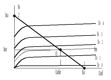 Через полученные две точки проведем нагрузочную прямую, и выберем на ней точку покоя, например точку О (Рис. 3.2). Для возможности более полного использования характеристик транзистора точку "О" рекомендуют выбирать в центральной области, н линейном участке, выходных характеристик. Эта точка характеризуется 3Я координатами IКп,UКБп,IЭп.