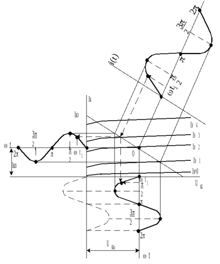 Для приращения входного тока относительно координаты точки покоя "О" на 25¸30%, можно считать, что усилитель работает в линейной области характеристик, что обеспечивает синусоидальные значения выходного тока (IK) и напряжения (UКБ), при синусоидальном входном воздействии.