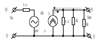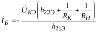 Предположим, что входное и выходное напряжения синфазны (пусть (+) по отношению к общей шине распложен как показано на Рис. 3.10). источник тока или ЭДС выходной цепи направлен так, чтобы обеспечить на выходе (+), в данном случае вверх. Теперь уточним направление источника тока (Iбh21Э). В соответствии с физическими принципами работы транзистора. Входное напряжение получило (+) приращение на базу относительно эмиттера. Следовательно транзистор закрывается и ток коллектора будет уменьшатся, т.е. приращение тока коллектора будет отрицательным, и направленным от коллектора к эмиттеру. Поскольку это противоречит формально проставленному направлению источника тока, то для соответствия необходимо изменить знак перед током (-Iбh21Э). Если противоречия нет – знак перед значением источника тока остается положительным. Формула для коэффициента усиления усилителя, в соответствии с этой методикой, дает знак "+" или "-", что указывает на фазовые соотношения усилителя.