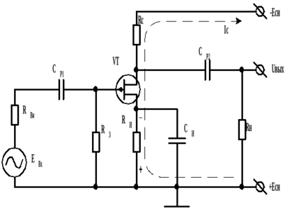 В данной схеме RИ,RЗ и СИ образуют цепочку автоматического смещения. На R И происходит падение напряжения обусловленное током стока, которое передается на затвор через резистор RЗ, и определяет положение рабочей точки, т.е. режим работы транзистора по постоянному току. СИ шунтирует RИ в режиме переменного тока, не нарушая тем самым положение точки покоя определенное в режиме по постоянному току.