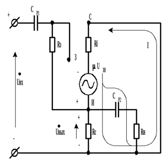 При расчете основных параметров каскада в диапазоне средних звуковых частот разделительными емкостями CР1 и СР2, как и в ранее рассмотренной схеме, можно пренебречь. Методика расстановки направлений напряжений и токов в модели, соответствует рассмотренной ранее при определении kU.
