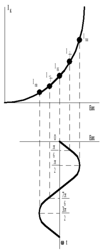 Зависимость тока коллектора от входного напряжения определяется сквозной характеристикой. И из-за искажений, при синусоидальном входном напряжении, получим несинусоидальный ток коллектора, который можно представить рядом Тейлора: